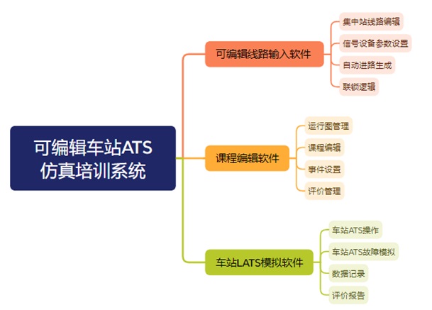 可编辑线路结构与信号设置的车站ATS模拟培训系统系统是采用计算机技术与仿真技术,以真实信号系统为研究对象,通过可编辑的方式对信号系统中集中站的线路结构(包括轨道与道岔)、信号机和车站进行输入与布置,在可编辑模型的基础上,实现列车自动进路以及控制逻辑及运行图管理,最终通过人机交互界面实现车站ATS正常及故障操作功能,从而模拟轨道交通的车站行车人员的的工作环境与工作状态,提升其业务水平和工作能力。