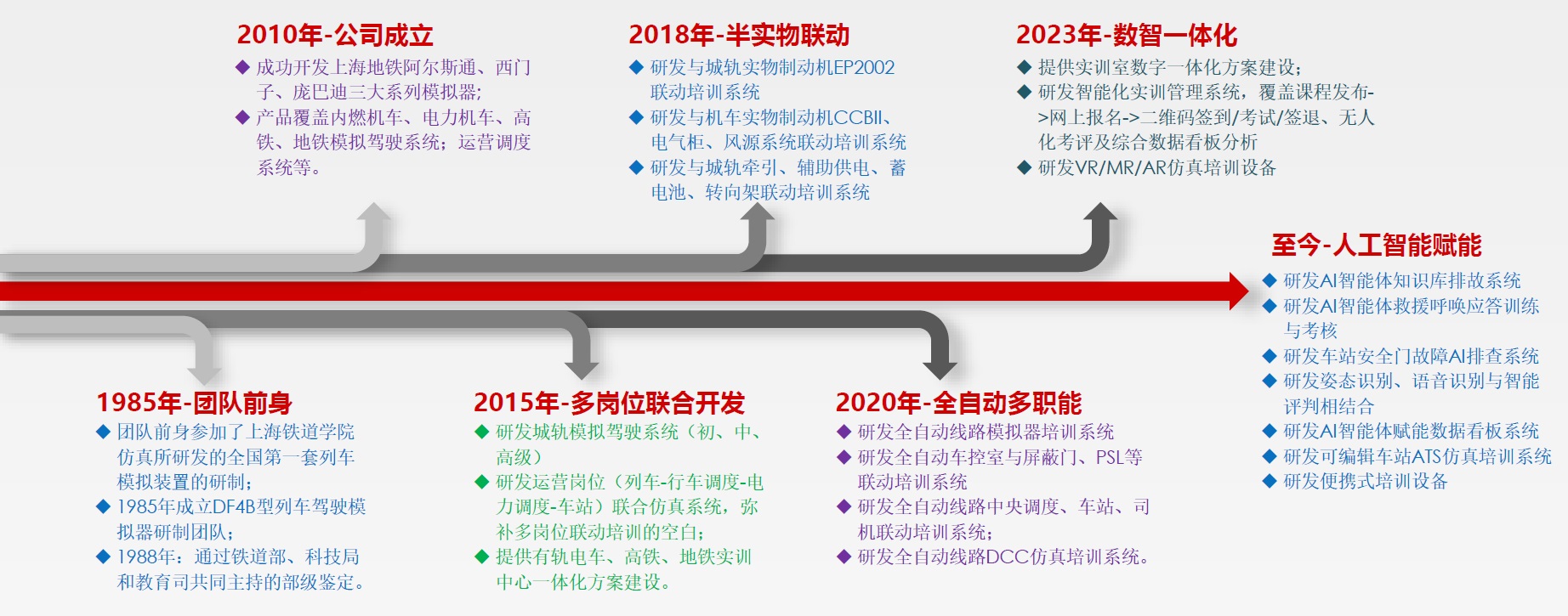自成立以来,公司始终以“以技术服务行业,以仿真培育人才”为核心理念,不仅为轨道交通行业人才梯队建设提供“基础实训—高阶技能提升”全链条设备支持,更通过定期技术培训、设备升级服务持续保障教学质量,助力行业人才培养标准化、技能提升高效化,为轨道交通行业高质量发展注入核心动能。